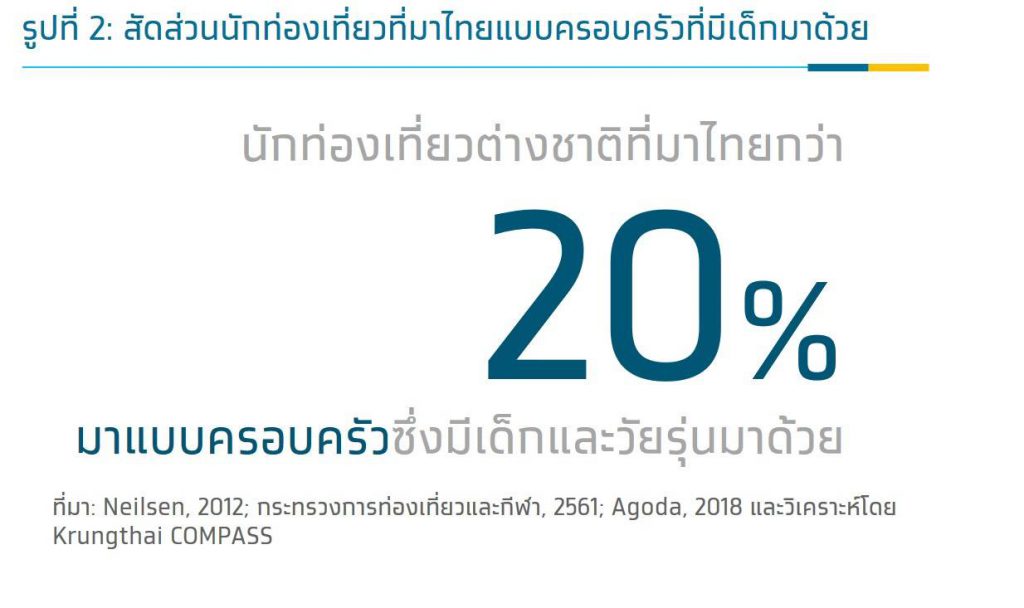 อย่างไรก็ดี หากพิจารณาเฉพาะนักท่องเที่ยวกลุ่มครอบครัวเท่านั้น คาดว่าน่าจะมีสัดส่วนกว่า 23% จากนักท่องเที่ยวต่างชาติทั้งหมด โดยส่วนใหญ่ประมาณ 85% ของนักท่องเที่ยวกลุ่มครอบครัว จะเป็นการมาเที่ยวที่มีเด็กมาด้วย ดังนั้นจึงประเมินว่านักท่องเที่ยวต่างชาติแบบครอบครัวที่มีเด็กมาด้วยมีสัดส่วนกว่า 20% ของนักท่องเที่ยวต่างชาติที่เดินทางมาไทย หรือคิดเป็นจำนวนกว่า 8 ล้านคนจากนักท่องเที่ยว 39.9 ล้านคนในปี 2019