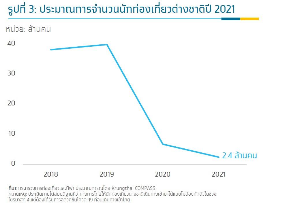 และเมื่อรวมกับความเสี่ยงที่การเดินทางแบบครอบครัวอาจยังทำไม่ได้ ทำให้ Krungthai COMPASS ประเมินว่าในปีนี้ไทยอาจมีนักท่องเที่ยวต่างชาติเพียง 2.4 ล้านคน ยิ่งกว่านั้น หากทางการจีนยังไม่อนุญาตให้นักท่องเที่ยวเดินทางนอกประเทศได้ จำนวนนักท่องเที่ยวต่างชาติก็อาจเหลือเพียง 2 ล้านคน